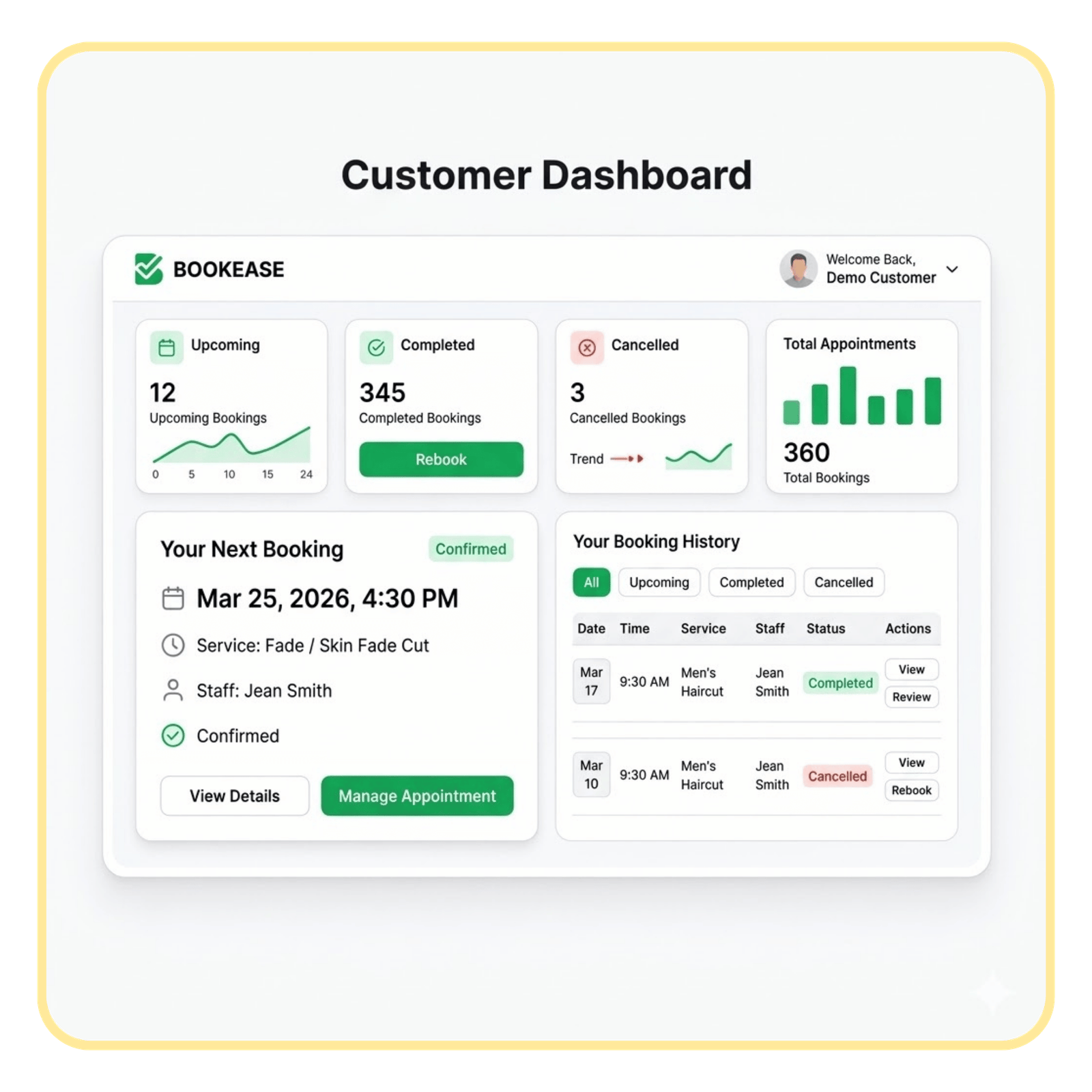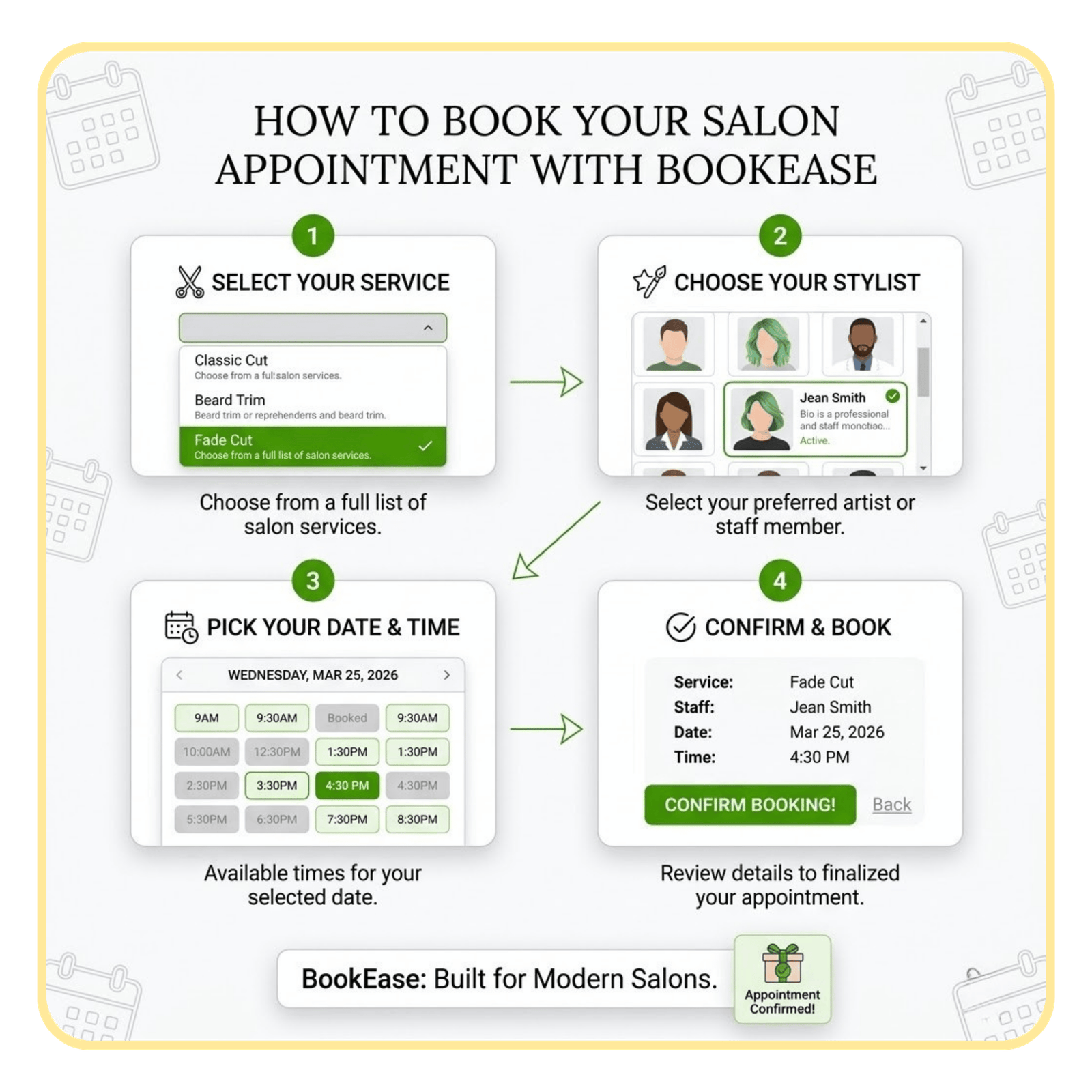 • Online booking by service, staff, date, and time slot